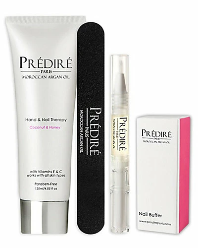 - Brittle and chipped nails problem cuticles and dry hands are a thing of the past with this all-inclusive Manicure Set!Predire Paris Moroccan Argan Oil Manicure Set is a complete and stimulating beauty treatment for your hands and nails. The kit utilizes the highly nourishing and restorative Moroccan Argan Oil to protect hands nails and cuticles. Argan Oil will keep nails strong and prevent them from chipping and cracking and our accompanied Argan Oil hand cream will leave hands & skin smooth and radiant!Almond milk hydrates the skin and helps with circulation. Honey nourishes the nails and has strong antibacterial qualities which will help nails and cuticles stay healthy.The kit contains:Nail FileUse our Predire Paris Moroccan Argan Oil Nail Clipper on a regular basis to trim your nails while carefully rounding them at the sides. Smooth away rough nail edges and shape your nails faster and easier than ever before without splitting the edges.Buffer BlockThe Predire Paris Moroccan Argan Oil Buffer stimulates nails in three easy steps.First step: Use the back of the buffer in a back-and-forth motion over the nail. Keep going for several seconds until the nail has a smooth sheen. Repeat this every month.Second step: Use the white strip to buff each nail for several seconds. This will remove all remaining ridges and stimulate the nail bed. Repeat every few weeks.Third step: Use the silkier purple side of the buffer to buff each nail for no more than 10 seconds until you reach a glossy shine. This brings out your natural oils.This is a super-smoothing hand and nail care treatment blended with natureas liquid gold; Moroccan Argan Oil. The cream bursts with restorative nutrients glides on smoothly and is absorbed quickly into the skin to help heal and protect. This elite treatment is packed with vitamins that will help even out the skin tone strengthen the skin and make it bright and soft.Nail and Cuticle SerumThe Nail and Cuticle Serum is a secret weapon that will transform dry and damaged cuticles almost overnight. The powerful Moroccan Argan Oil makes a fast and visible impact on the nails making them stronger and smoother with fewer ridges enhances natural nail growth and battles brittleness and splitting edges.